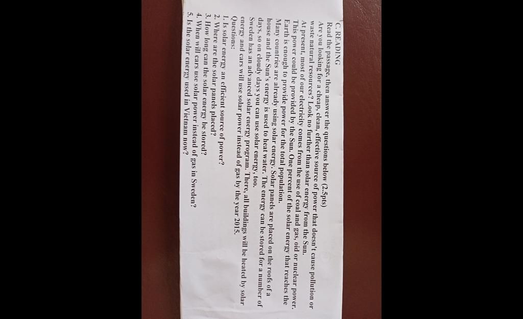 Bạn có đang tìm kiếm một nguồn tài nguyên rẻ, sạch, hiệu quả, không gây ô nhiễm, lãng phí ? Nhìn không xa hơn là năng lượng mặt trời từ Mặt trời. Hiện tại, phần lớn điện năng của chúng ta đến từ việc sử dụng than, gas và khí đốt, dầu mỏ hoặc năng lượng hạt nhân. Nguồn năng lượng này có thể được cung cấp bởi mặt trời. Một phần trăm năng lượng mặt trời truyền đến Trái đất là đủ để cung cấp năng lượng cho toàn dân số. Nhiều quốc gia đã và đang sử dụng năng lượng mặt trời. Các tấm pin mặt trời được đặt trên mái của một ngôi nhà và năng lượng mặt trời được sử dụng để làm nóng nước. Năng lượng có thể được dự trữ trong một số ngày, vì vậy vào những ngày nhiều mây, bạn cũng có thể sử dụng năng lượng mặt trời.