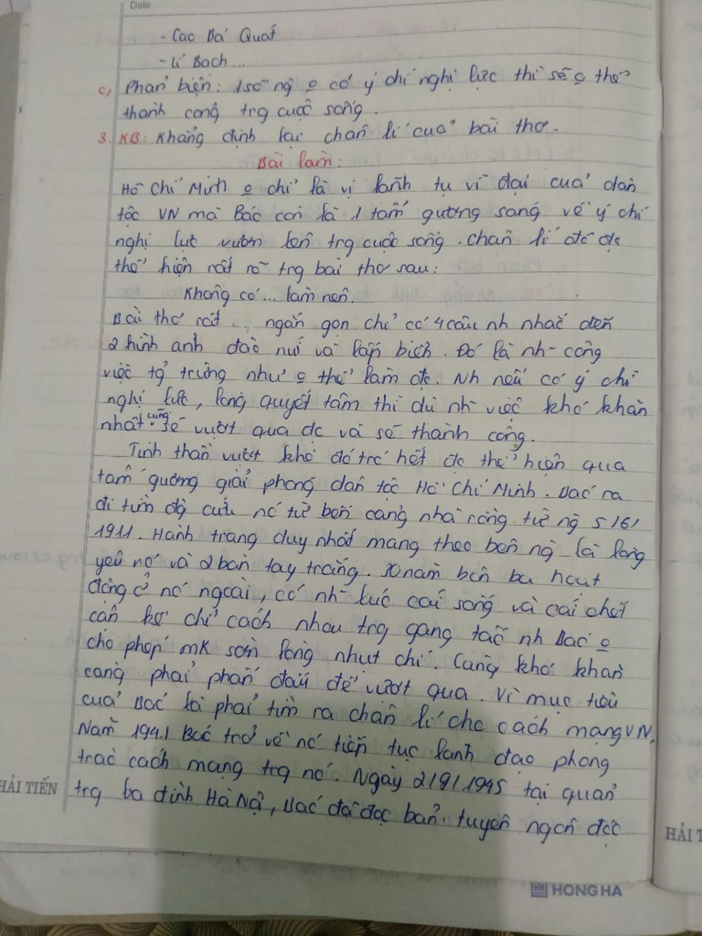 Qua bốn câu thơ, Bác muốn nhắn nhủ thanh niên phải chú trọng bồi dưỡng về chí khí cách mạng. Người cho rằng, thanh niên muốn thực hiện ước mơ, hoài bão cao đẹp, muốn làm được việc lớn ích nước, lợi dân thì trước hết phải tự mình nâng cao chí khí, tuyệt đối trung với nước, với Đảng, hiếu với dân. Học tập và làm theo lời Bác dạy, lớp lớp các thế hệ thanh niên Việt Nam luôn tiếp nối truyền thống cha anh, phát huy tinh thần đoàn kết, xung kích, sáng tạo, vươn lên chinh phục các đỉnh cao trên mọi lĩnh vực công tác, góp phần vào thắng lợi trong các cuộc kháng chiến chống thực dân, đế quốc xâm lược, giải phóng đất nước. Trong thời kỳ đổi mới đất nước, hội nhập quốc tế, toàn cầu hóa và cuộc Cách mạng công nghiệp lần thứ tư, thanh niên Việt Nam tiếp tục vươn lên mạnh mẽ trên các lĩnh vực, là lực lượng quan trọng góp phần đưa đất nước hội nhập nhanh hơn, sâu hơn; thanh niên thực sự là lực lượng nòng cốt, là động lực của sự phát triển đất nước trong thời kỳ đổi mới. Thanh niên phải có tinh thần: Đâu cần thanh niên có, đâu khó có thanh niên, gian khổ thì đi trước, hưởng thụ sau mọi người, góp phần xứng đáng vào sự nghiệp kháng chiến và kiến quốc. Trong sự nghiệp công nghiệp hóa, hiện đại hóa và hội nhập quốc tế, việc rèn luyện và nâng cao chí khí cách mạng đang đặt ra cho mọi đoàn viên, thanh niên trên tất cả lĩnh vực hoạt động, nhất là đối với những việc mới, việc khó cần sự nỗ lực, cố gắng cao. Mặt trái của cơ chế thị trường đang tác động tiêu cực đến thế hệ trẻ. Chính vì vậy, công tác giáo dục, bồi dưỡng, rèn luyện thanh niên sống có chí khí, hoài bão, lý tưởng, như Chủ tịch Hồ Chí Minh đã dạy, để thanh niên không mất phương hướng, không bị lôi cuốn vào những thói hư tật xấu, lối sống thực dụng… là việc rất quan trọng và cấp bách. Giáo dục thanh niên học tập và làm theo lời dạy của Người còn góp phần tích cực vào việc đào tạo những chủ nhân tương lai của nước nhà, để họ trở thành những người kế tục xứng đáng sự nghiệp cách mạng của cha anh. Là một bộ phận của thanh niên Việt Nam, thanh niên quân đội luôn có vai trò hết sức quan trọng; đã kế thừa, phát huy truyền thống yêu nước, tinh thần tình nguyện, góp phần cùng toàn Đảng, toàn dân, toàn quân viết nên những trang sử hào hùng của dân tộc, xây đắp nên truyền thống tốt đẹp của Quân đội nhân dân Việt Nam anh hùng. Trong thời kỳ đổi mới, thực hiện nhiệm vụ xây dựng và bảo vệ Tổ quốc, thanh niên quân đội luôn là lực lượng xung kích nòng cốt, xây dựng Quân đội nhân dân cách mạng, chính quy, tinh nhuệ, từng bước hiện đại; tích cực huấn luyện, SSCĐ; đi đầu trong phòng, chống thiên tai; khắc phục khó khăn, gian khổ; nêu cao tinh thần cảnh giác cách mạng, tự giác học tập, rèn luyện, phấn đấu, hoàn thành tốt mọi nhiệm vụ được giao. Mong được hay nhất. Rút gọnQua bốn câu thơ, Bác muốn nhắn nhủ thanh niên phải chú trọng bồi dưỡng về chí khí cách mạng. Người cho rằng, thanh niên muốn thực hiện ước mơ, hoài bão cao đẹp, muốn làm được việc lớn ích nước, lợi dân thì trước hết phải tự mình nâng cao chí khí, tuyệt... xem thêm