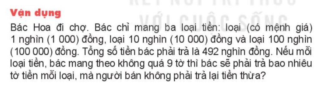 Vậy để người bán hàng không phải trả lại tiền thừa thì số tờ tiền mỗi loại bác phải trả là: 4 tờ loại 100 nghìn (100 000) đồng; 9 tờ 10 nghìn (10 000) đồng và 2 tờ loại 1 nghìn (1 000) đồng.