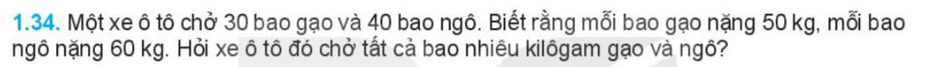 Số kg gạo là: 50.30=1500 (kg) Số kg bao ngô là: 60. 40= 2400(kg) Xe ô tô chở số gạo và ngô là: 1500+2400=3900 (kg)