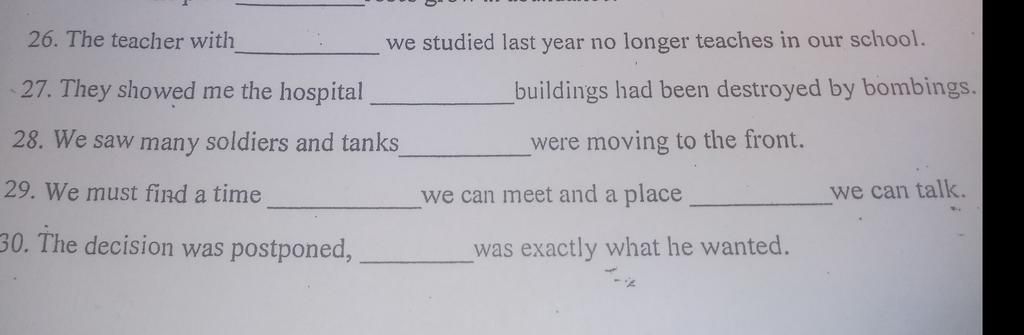 27.where Where thay thế cho trạng ngữ chỉ nơi chốn trong câu Họ chỉ tôi cái bệnh viện, nơi mà các tòa nhà bị phá hủy bởi bom