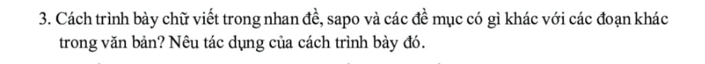Chữ viết trong nhan đề, sapo và các đề mục được làm cho nổi bật hơn, nhan đề được in màu đỏ hồng, sapo được viết in nghiêng, các đề mục được đánh số và in đậm. Nhờ vậy, nhan đề, sapo và đề mục sẽ trở nên vô cùng nổi bật với người đọc, giúp văn bản trở nên trực quan, khoa học, dễ nhìn, dễ đọc, lôi cuốn bạn đọc hơn. Người đọc dễ dàng nắm được bố cục và nội dung của các phần trong văn bản.