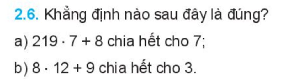 a ) Ta có : 219 .7 . 8 = 1533 + 8 = 1541 và 1541 không chia hết cho 7 ⇒ Vậy khảng định 219 .7 + 8 chia hết cho 7 là : sai b ) Ta có: 8 . 12 + 9 = 96 + 9 = 105 và 105 chia hết cho 3 ⇒ Vậy khẳng định 8 .12 + 9 chia hết cho 3 là : đúng :)))