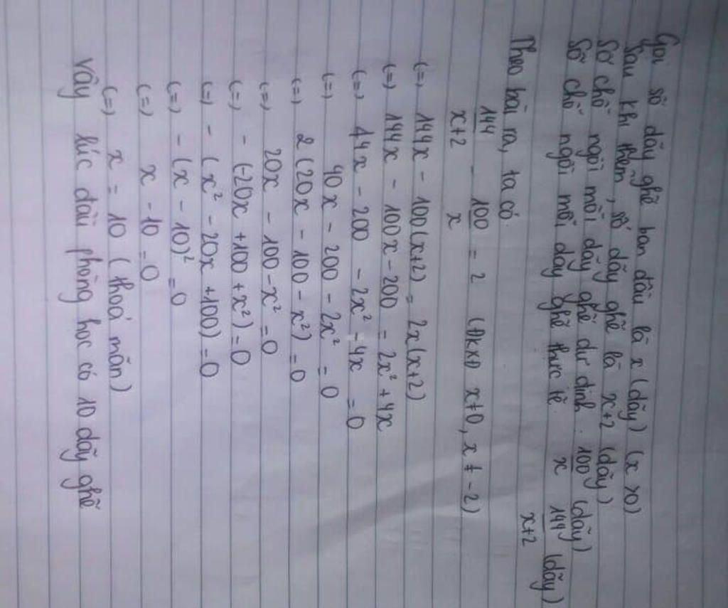 Gọi số chỗ ngồi mỗi dãy ghế lúc sau :`144/(x+2)(dãy) `