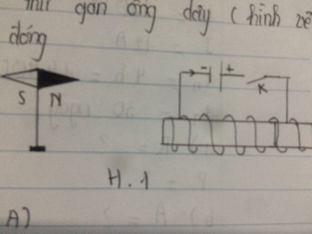 1.Kim nam châm bị đẩy ra, vì khi đóng khóa K thì dòng điện sẽ chạy rồi áp dụng quy tắc nắm tay phải thì 2 bên là ống dây cực bắc mà bên kim nam châm cũng cực bắc suy ra 2 bên đẩy nhau