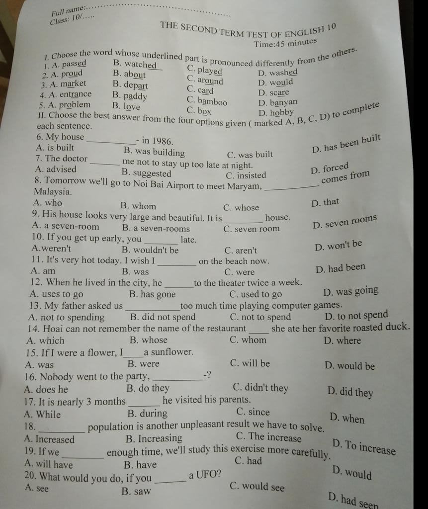 II. Choose the best answer from the four options given ( marked A,B,C or D) to complete each sentence