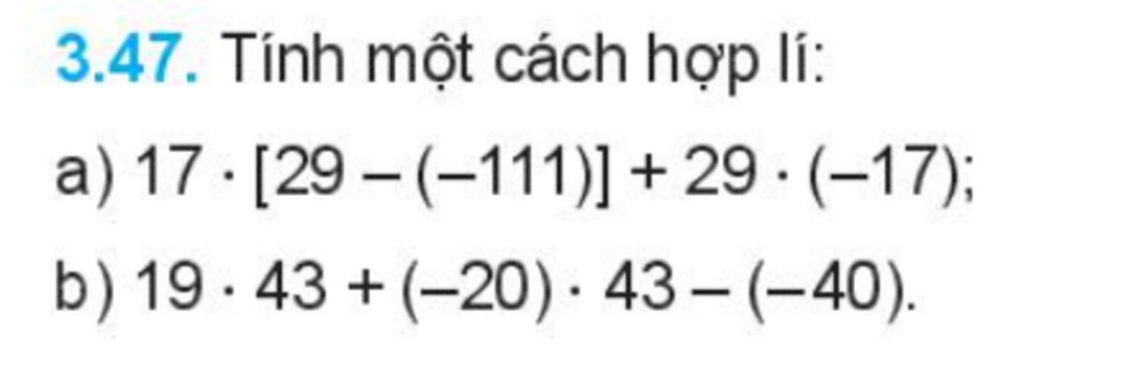 a. 17 ⋅ ( 29 − ( − 111 ) ) + 29 ⋅ ( − 17 ) = 17 ⋅ ( 29 + 111 ) − 29 ⋅ 17 = 17 ⋅ ( 29 + 111 − 29 ) = 17 ⋅ ( 29 − 29 + 111 ) = 17 ⋅ 111 = 1887 b. 19 ⋅ 43 + ( − 20 ) ⋅ 43 − ( − 40 ) = 19 ⋅ 43 − 20 ⋅ 43 + 40 = 43 ( 19 − 20 ) + 40 = 43 ⋅ ( − 1 ) + 40 = − 43 + 40 = − 3 Rút gọna. 17 ⋅ ( 29 − ( − 111 ) ) + 29 ⋅ ( − 17 ) = 17 ⋅ ( 29 + 111 ) − 29 ⋅ 17 = 17 ⋅ ( 29 + 111 − 29 ) = 17 ⋅ ( 29 − 29 + 111 ) = 17 ⋅ 111 = 1887 b. 19 ⋅ 43 + ( − 20 ) ⋅ 43 − ( − 40 ) = 19 ⋅ 43 − 20 ⋅ 43 + 40 = 43 ( 19 − 20 ) + 40 = 43 ⋅ ( − 1 ) + 40 = −... xem thêm