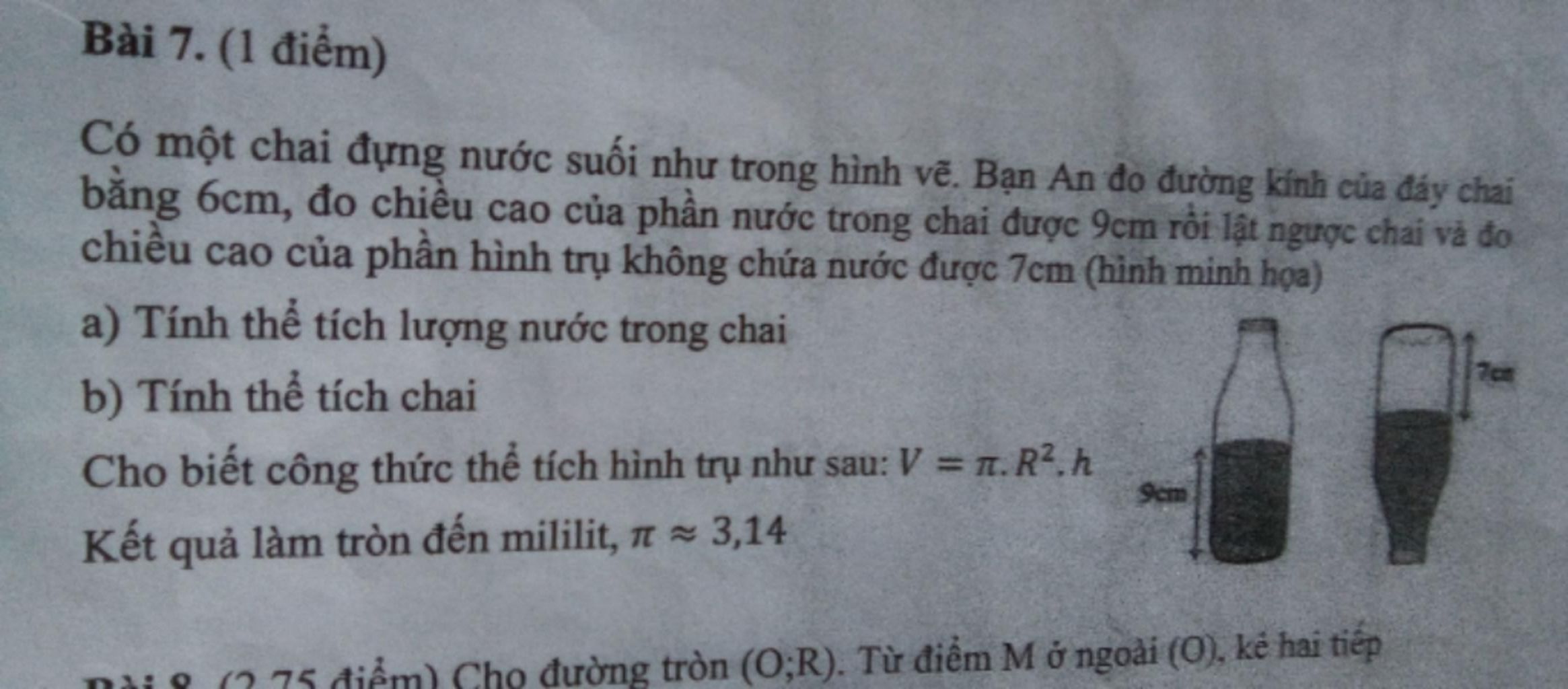 `a)` Bán kính đáy chai là: $6:2=3(cm)$