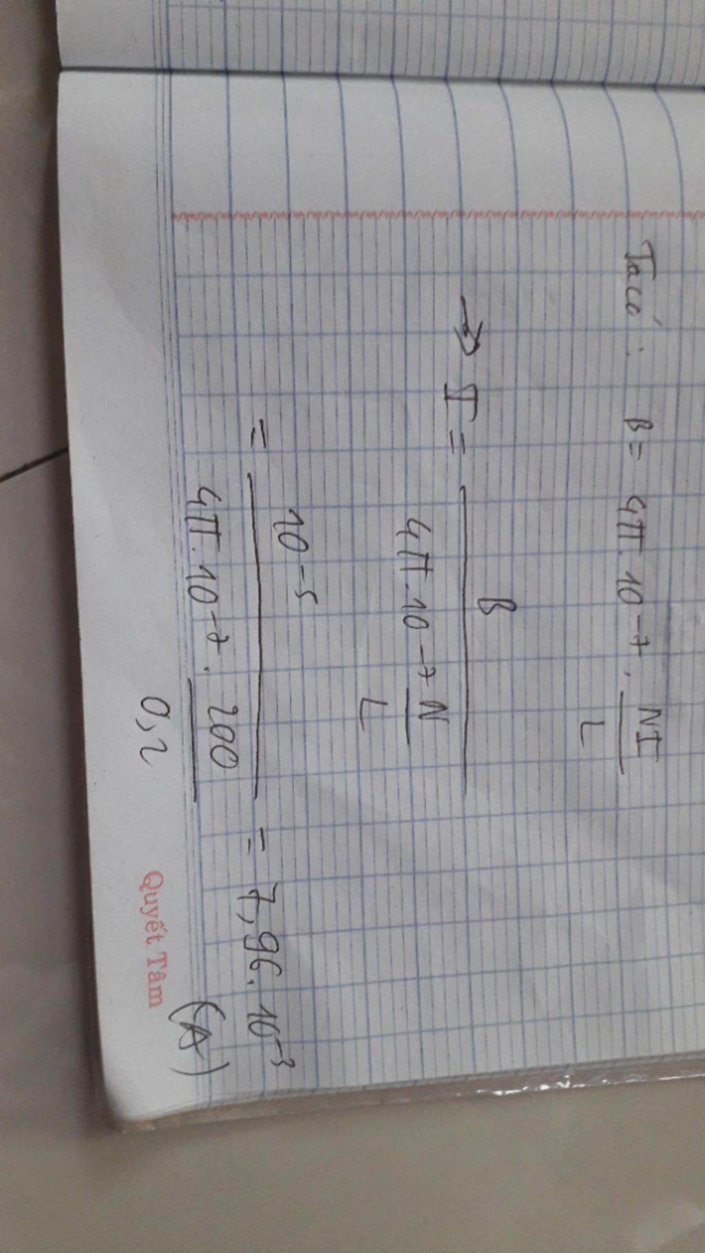 ⇒ `I=\frac{B.L}{4π.10^{-7}.n}=\frac{10^{-5}.0,2}{4π.10^{-7}.200}=7,96.10^{-3} \ (A)`