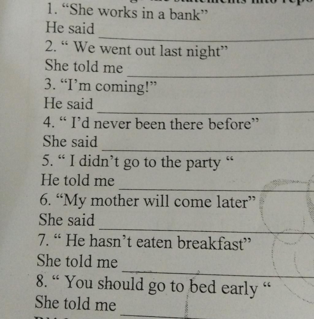 1. He said that she worked in a bank. 2. She told me that they had gone the night before. 3. He said that he was coming. 4. She said that he had never been there before. 5. He told me that he hadn't gone to the party. 6. She said that her mother would come later. 7. She told me that he hadn't eaten breakfast. 8. She told me that I should go to bed early. Rút gọn1. He said that she worked in a bank. 2. She told me that they had gone the night before. 3. He said that he was coming. 4. She said that he had never been there before. 5. He told me that he hadn't gone to the party. 6. She said that her mother would ... xem thêm