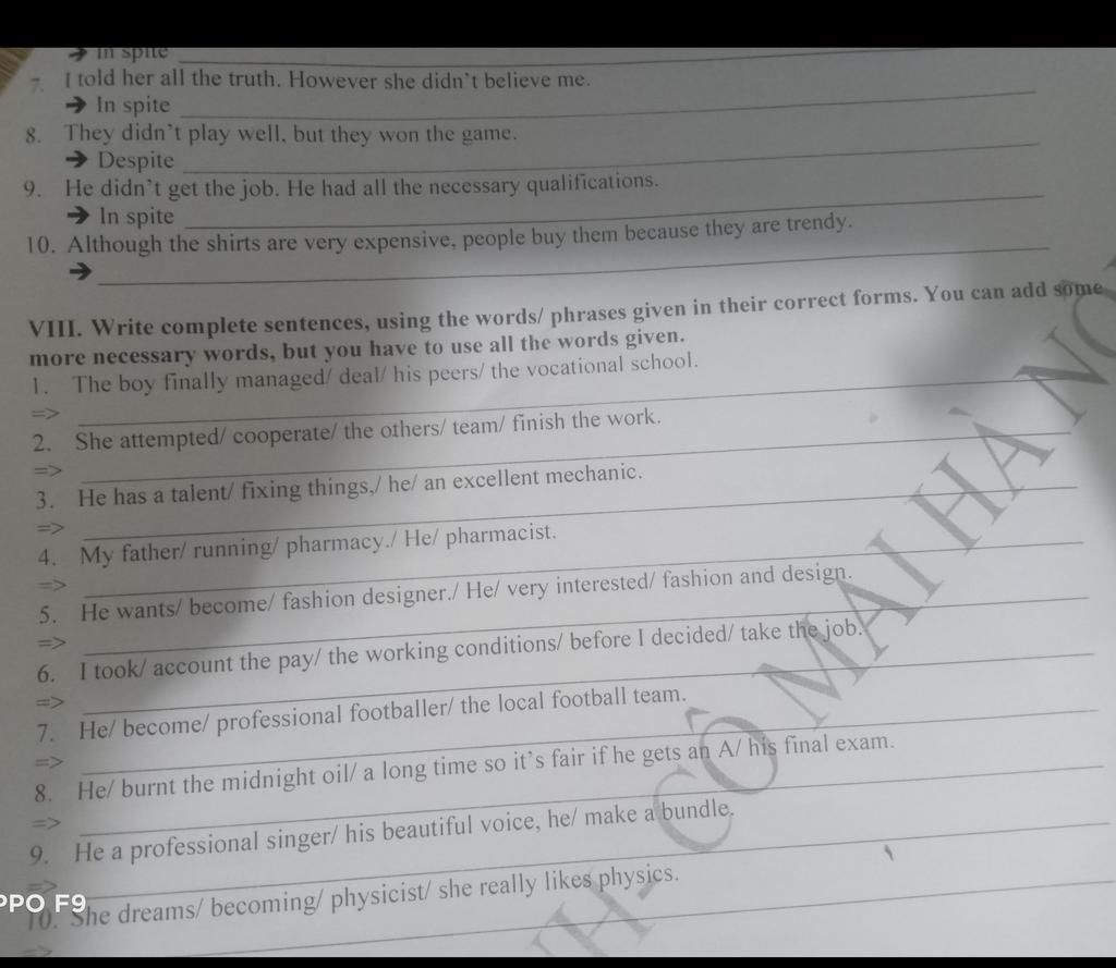 VIII. Write complete sentences, using the words/ phrases given in their correct forms.