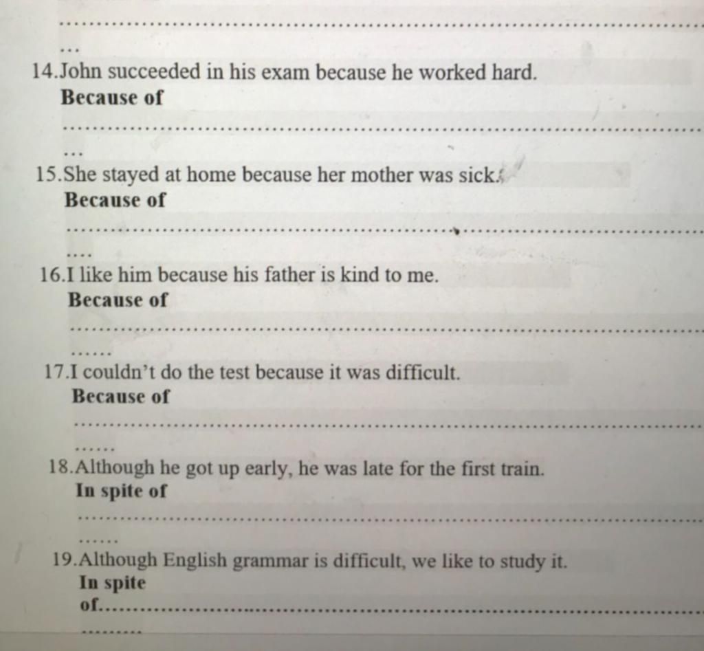 Thật ra câu 19 kia có nhiều cách chuyển lắm, chuyển như bạn trên cũng không sai, chuyển như bạn dưới cũng không sai nhưng theo mình, bạn 2 nên thêm "the" vào trước "difficult English grammar" để tránh hiểu nhầm là sau "In spite of + N/Ving" chứ không phải là "in spite of +Adj ". Rút gọnThật ra câu 19 kia có nhiều cách chuyển lắm, chuyển như bạn trên cũng không sai, chuyển như bạn dưới cũng không sai nhưng theo mình, bạn 2 nên thêm "the" vào trước "difficult English grammar" để tránh hiểu nhầm là sau "In spite of + N/Ving" chứ không p... xem thêm