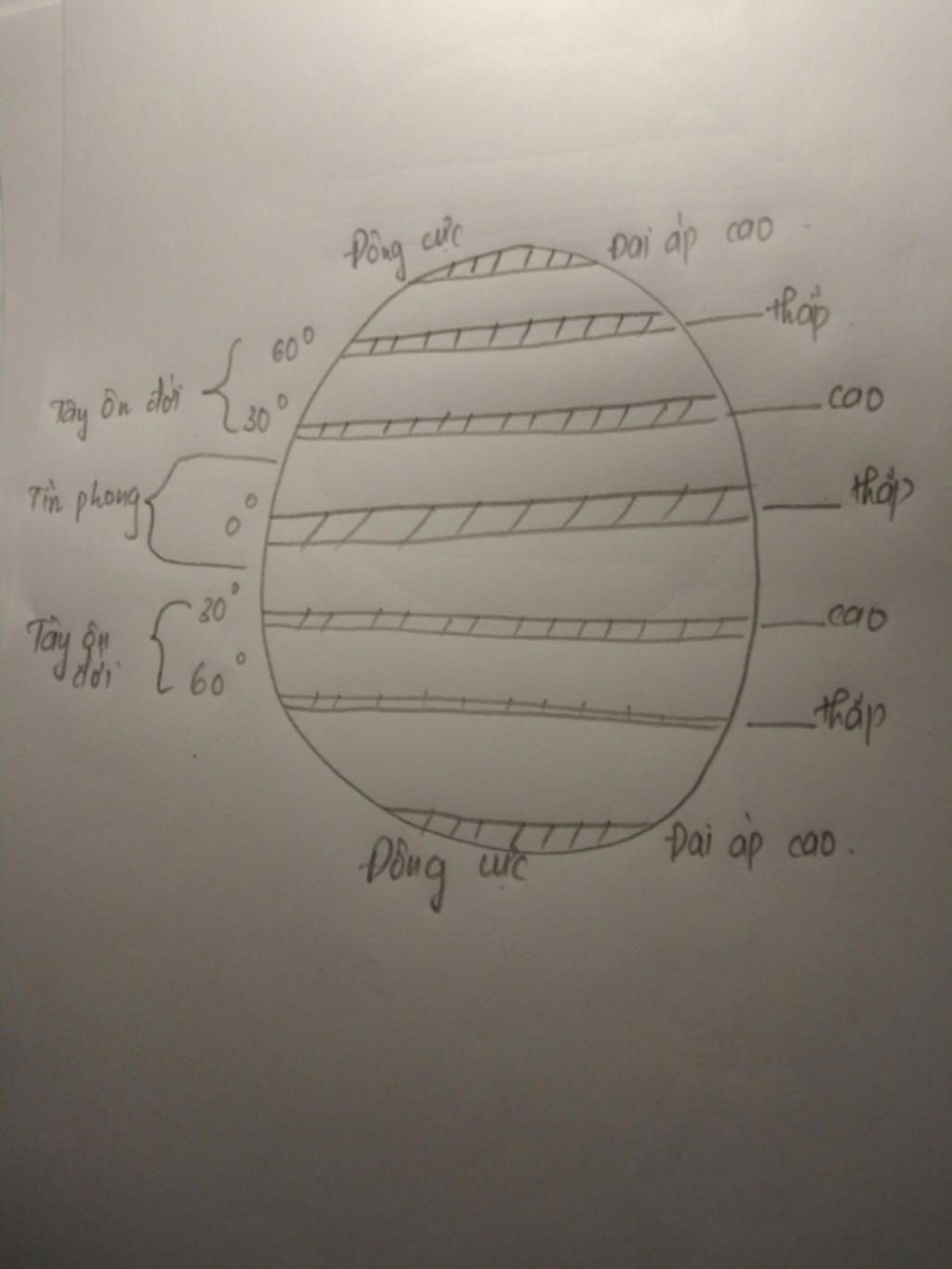 sơ đồ các đai khí áp, các loại gió thổi thường xuyên trên Trái Đất và các đới khí hậu trên Trái Đất.
