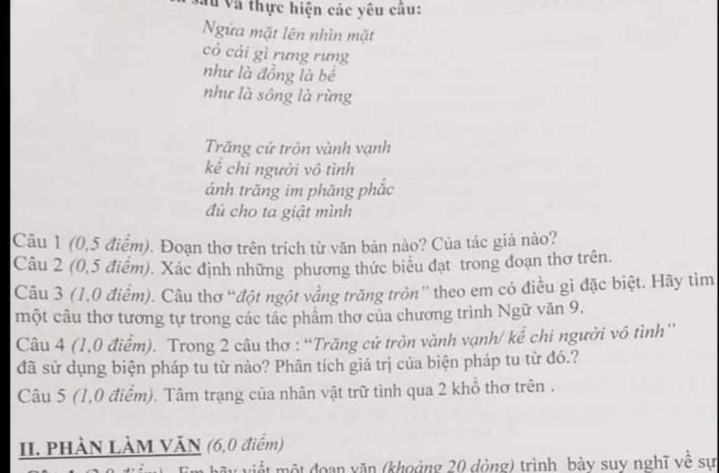 Cau 1 (0,5 điêm). Đoạn thơ trên trích từ văn bản nào? Của tác già nào?