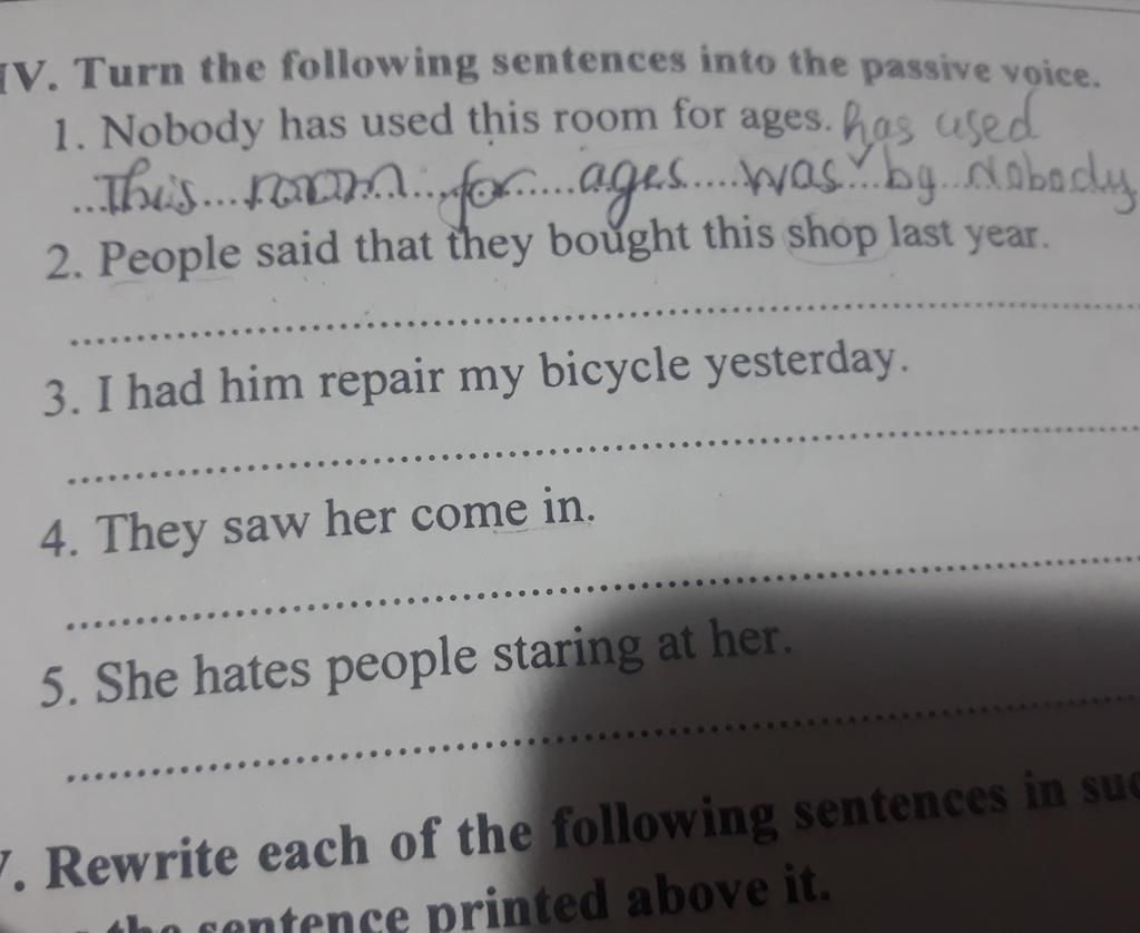 1. This room hasn't used for ages. ( chuyển tân ngữ This room làm chủ ngữ câu bị động rồi chia động từ use ở dạng phân từ 2 , bỏ nobody vì không cần thiết nhưng has phải ở dạng phủ định )