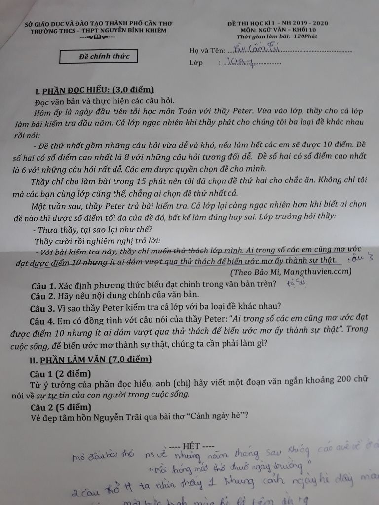 4. Câu nói của thầy rất đúng. Vì như câu truyện, ai cũng muốn được điểm cao nhưng ai cũng sợ hãi và bị kìm nén trước thử thách trước mắt nên k có số điểm mà mình mong muốn. Giống như chúng ta hiện tại, ai cũng có nhưng mơ ước, khát khao và hoài bão của riêng mình nhưng mấy ai có thể tự tin vào năng lực của mình mà dám đương đầu với khó khăn. Như vậy, nếu muốn biến ước mơ thành sự thật, trước hết cta cần tin tưởng vào chính mình, luôn nghĩ mình sẽ làm được và không nghi ngờ khả năng của bản thân. Sau đó vận dụng hết những hiểu biết và tài năng để hoàn thành thử thách cần đối diện. Có như vậy, ta mới có được thứ mình mong muốn, kể cả khi thất bại ta cũng không hối tiếc vì những gì ta đã làm được.