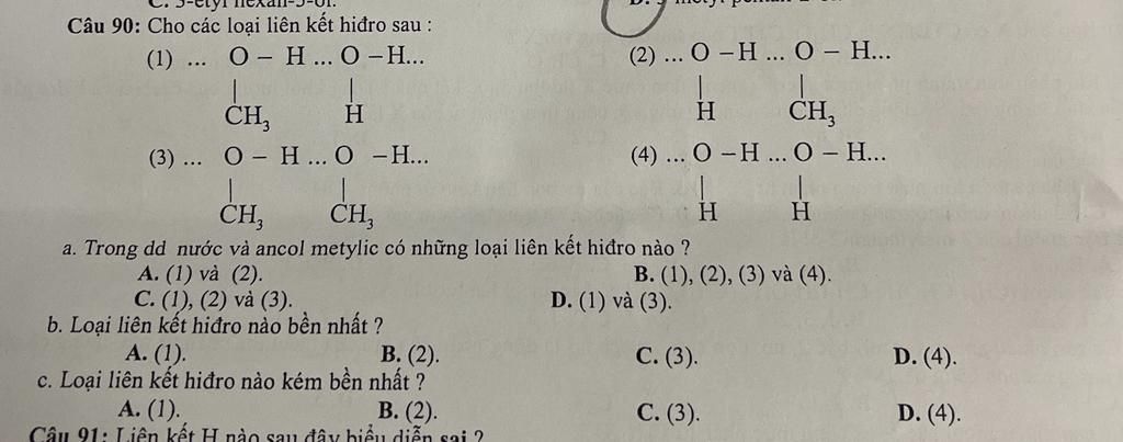 c) Liên kết hidro kém bền nhất là dạng thứ \(4); do vậy nhiệt độ sôi của ancol thấp hơn nước.