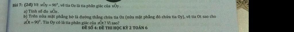 a) Ta có: `hat{xOy}=90^o` và `Oz` là tia phân giác của `hat{xOy}`