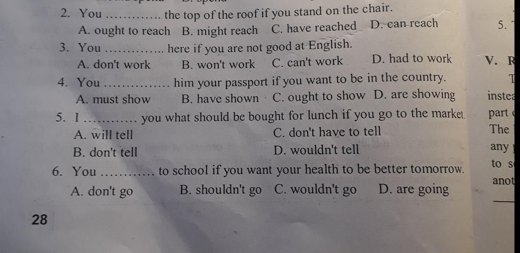 4. A. must show ( nghĩa cả câu: Bạn nên đưa hộ chiếu của mình cho anh ấy nếu bạn muốn ở trong đất nước này )
