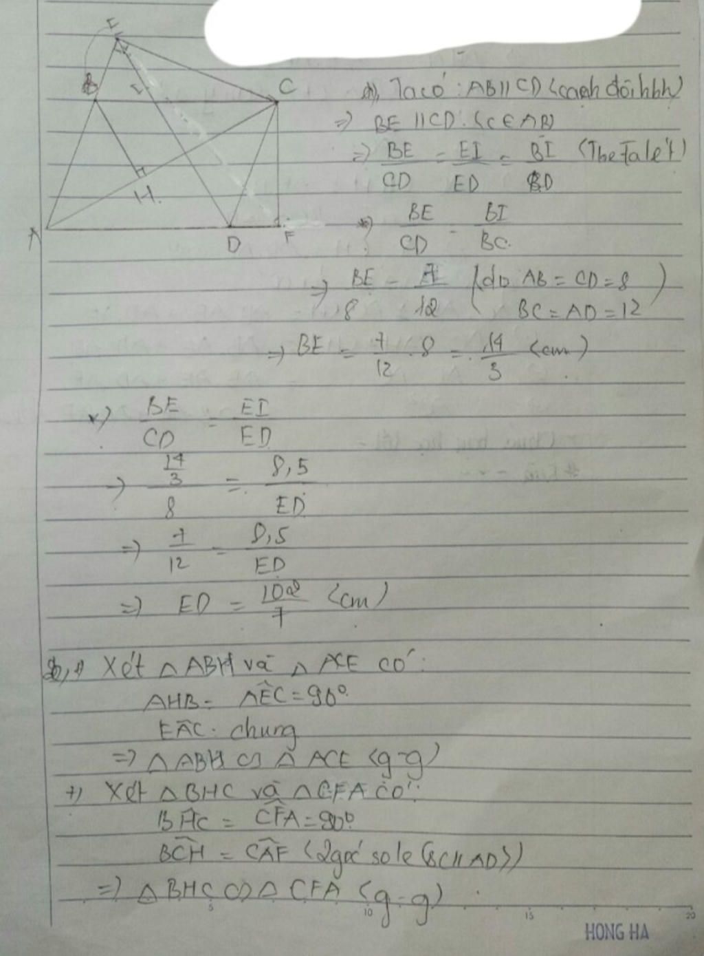 Cho hình bình hành ABCD có AD=12cm,AB=8cm.Từ C kẻ CE ⊥ AB tại E; CF ⊥ ⊥AD tại F và kẻ BH ⊥AC tại H. Nối E với D cắt BC tại I , biết BI=7cm, EI-8,5 cm