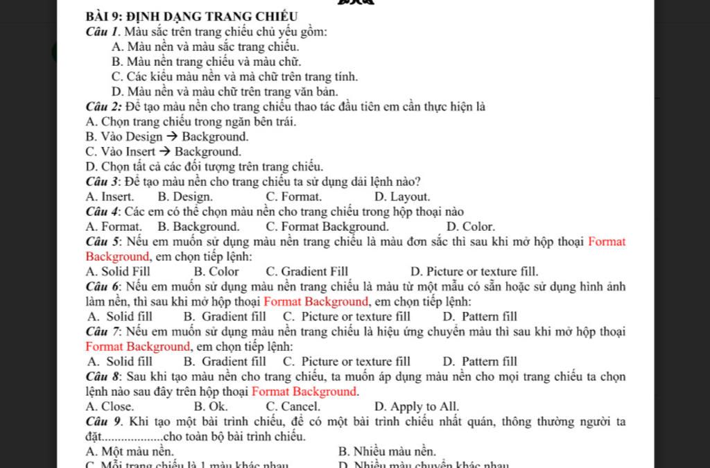 Câu 2: Để tạo màu nền cho trang chiếu thao tác đầu ti ...
