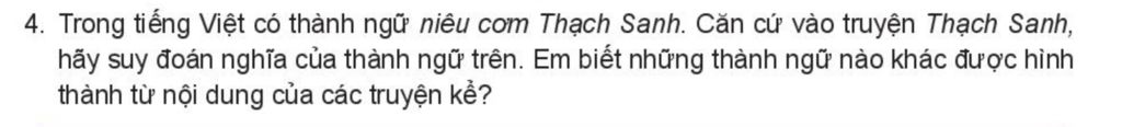 - Một số thành ngữ được hình thành từ các truyện kể như: đẽo cày giữa đường (Truyện Đẽo cày giữa đường), Thạch Sùng còn thiếu mẻ kho (truyện Thạch Sùng), hiền như cô Tấm (truyện Tấm Cám), …