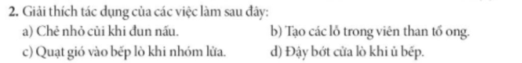 C Quạt gió vào bếp lò khi nhóm lửa nhằm cung cấp độ ôxy cho quá trình cháy được dễ dàng hơn tăng sự tiếp xúc giữa nhiên liệu và không khí