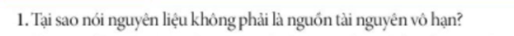 Nguyên liệu không phải là nguồn tài nguyên vô hạn vì nó được hình thành qua giai đoạn đặc biệt của quá trình biến hóa tự nhiên của Trái Đất , nên ít và phải mất rất nhiều thời gian để tái tạo lại.