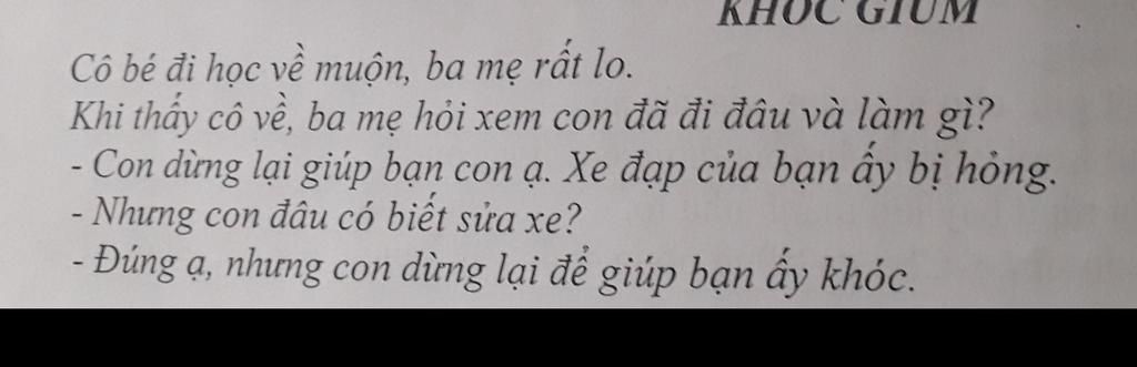 Văn bản trên đã cho ta thấy tấm lòng sẻ chia, yêu thương của cô bé dành cho người bạn. Chúng ta có nhiều cách thể hiện thiện chí giúp đỡ người khác. Cô bé cũng chọn cho mình một các rất đặc biệt. Khi gặp một người bạn bị hỏng xe, nếu không biết sửa, cô bé có thể bỏ đi mà không cần quan tâm. Thế nhưng, cô bé đã dừng lại để giúp bạn ấy khóc. Khóc chính là cách để an ủi với nỗi buồn của người khác. Sự an ủi đó như dòng suối mát đối với tâm hồn. Cô bé là tấm gương về tình yêu thương tốt đẹp mà chúng ta cần học tập.