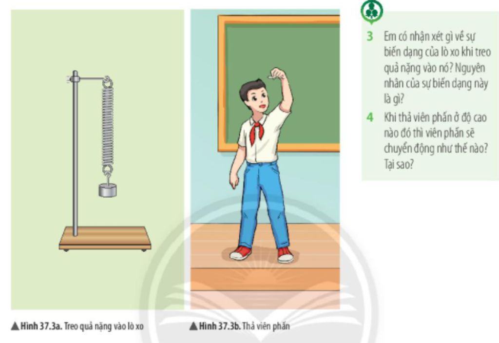 Hình 37.1b: Viên phấn sẽ rơi thẳng đứng xuống dưới vì viên phấn chịu tác dụng của trọng lực.