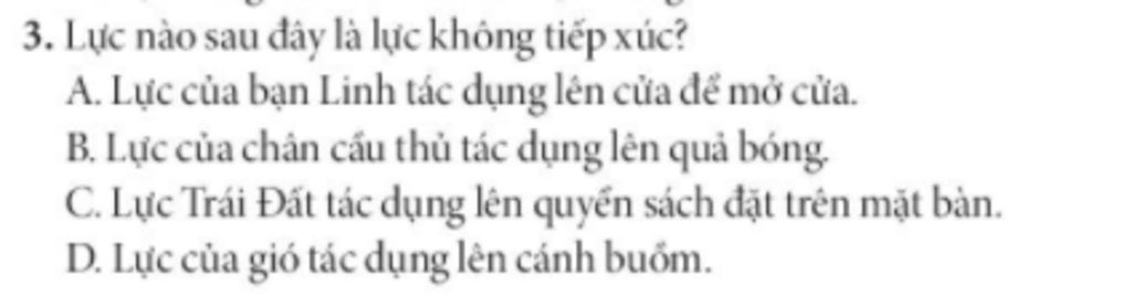 Lực của Trái Đất tác dụng lên quyển sách đặt trên mặt bàn là lực không tiếp xúc vì đây lực hấp dẫn của Trái Đất, Trái Đất và quyển sách không tiếp xúc với nhau.