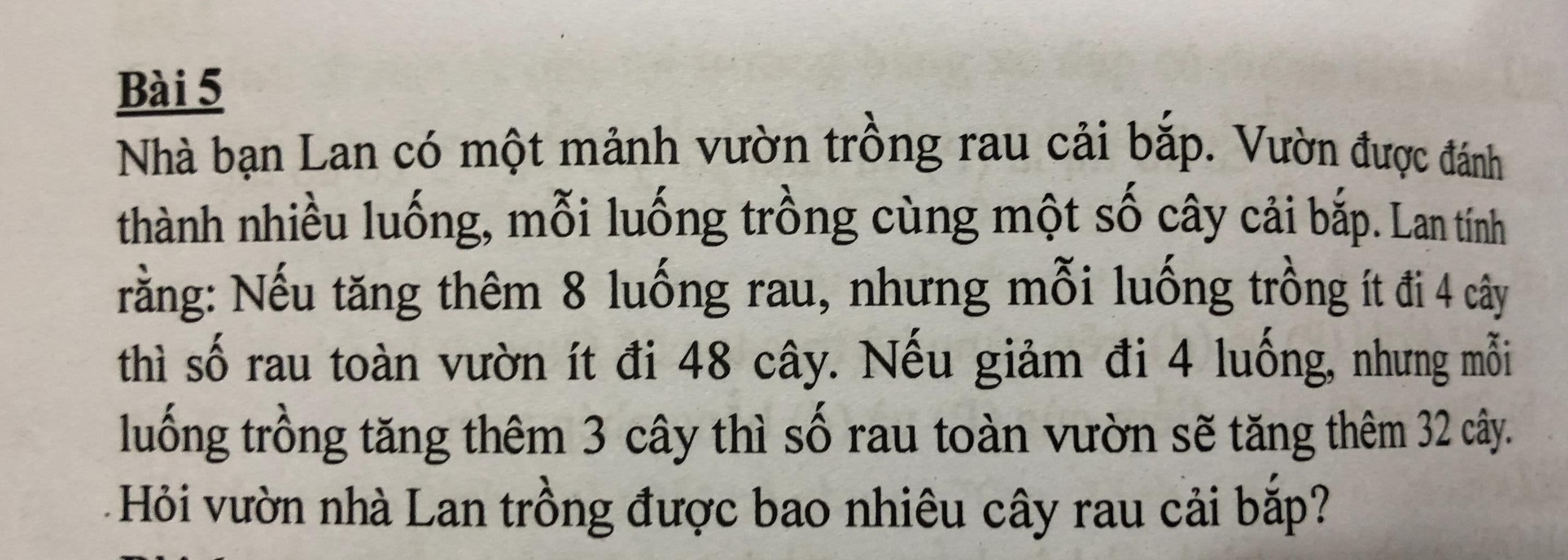 Gọi số luống rau và số cây trồng trong 1 luống ban đầu là x và y (luống, cây rau) (x,y>0)