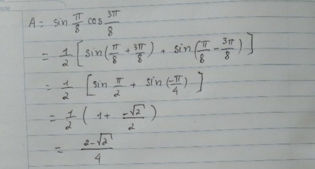 $\to A = \dfrac12\left[\sin\left(\dfrac{\pi}{8} + \dfrac{3\pi}{8}\right) + \sin\left(\dfrac{\pi}{8} - \dfrac{3\pi}{8}\right)\right]$