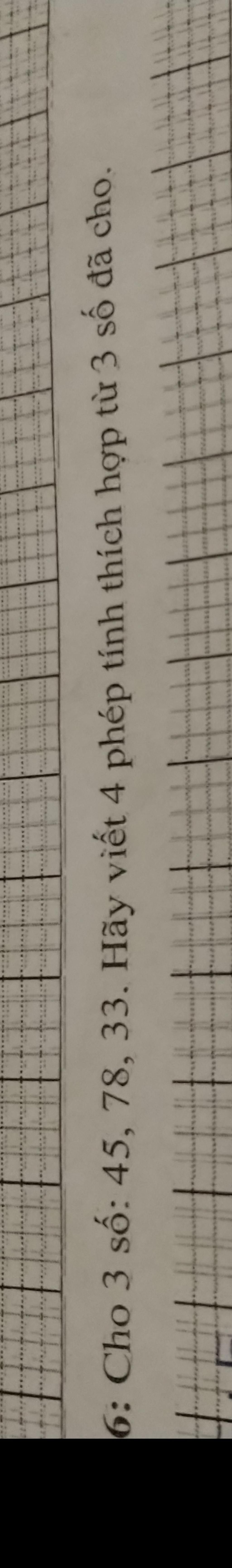 Giải thích các bước giải: 45 + 33 = 78 33 + 45 = 78 78 - 45 = 33 đó hc tốt nhoa !