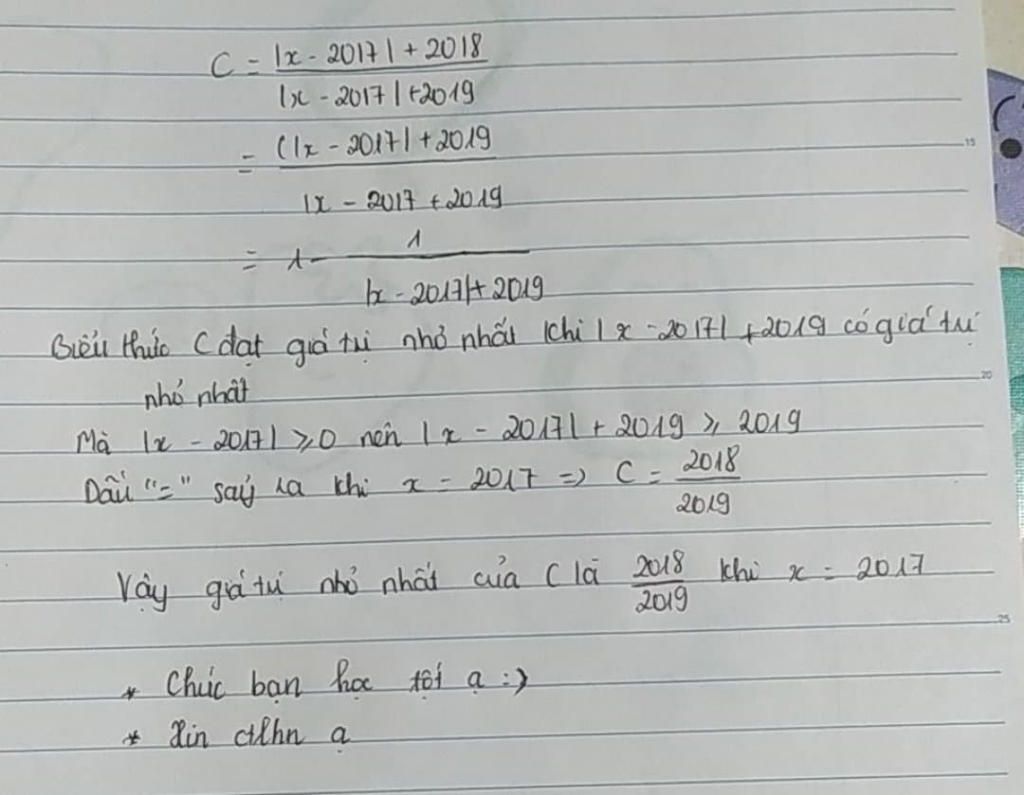 Vậy giá trị nhỏ nhất của biểu thức `C = 2018/2019` khi đó `x= 2017`