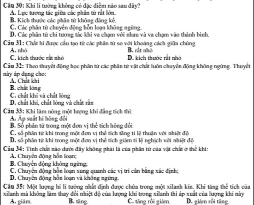 Câu 30: Khí lí tưởng không có đặc điểm nào sau đây?