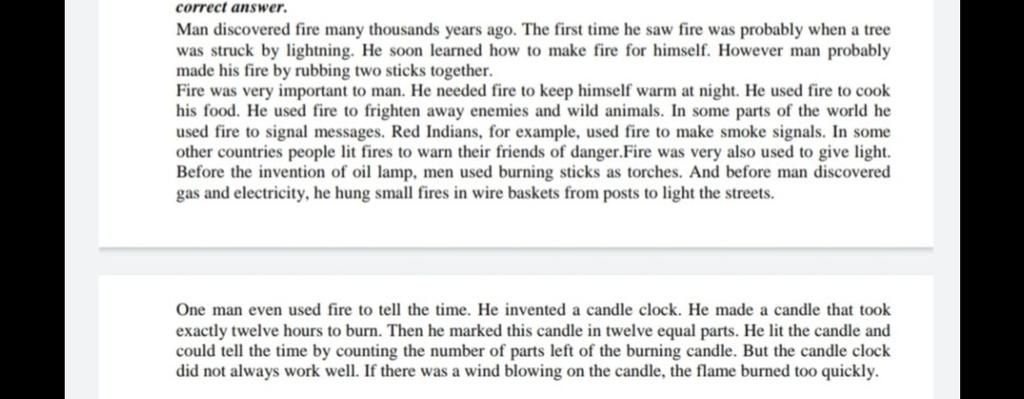 Một người đàn ông thậm chí còn dùng lửa để đo thời gian. Anh ta đã phát minh ra đồng hồ nến. Anh ấy đã làm một ngọn nến cháy hết trong vòng 12 giờ. Sau đó anh ta chia cây nến này thành mười hai phần bằng nhau. Anh ấy thắp sáng ngọn nến và có thể biết thời gian bằng cách đếm số phần còn lại của ngọn nến đang cháy. Nhưng đồng hồ nến không phải lúc nào cũng hoạt động tốt. Nếu có gió thổi vào ngọn nến, ngọn lửa sẽ cháy quá nhanh.