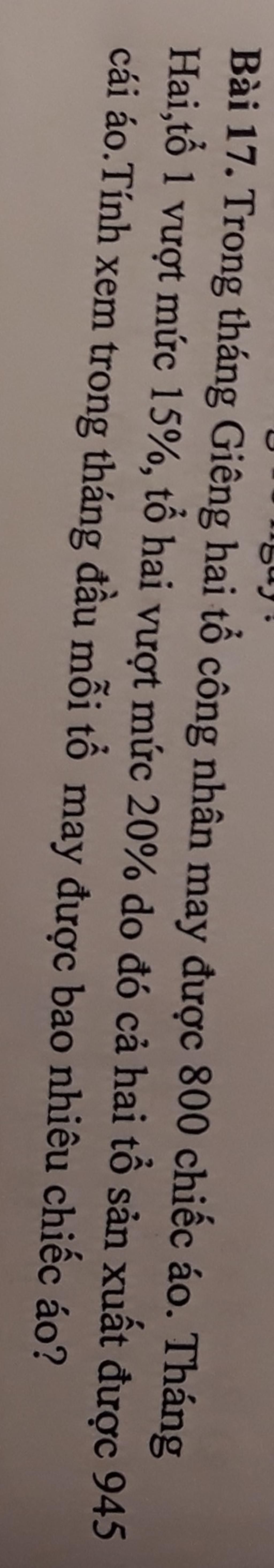 Vì tháng Hai, cả hai tổ may được `945` cái áo nên ta có phương trình :