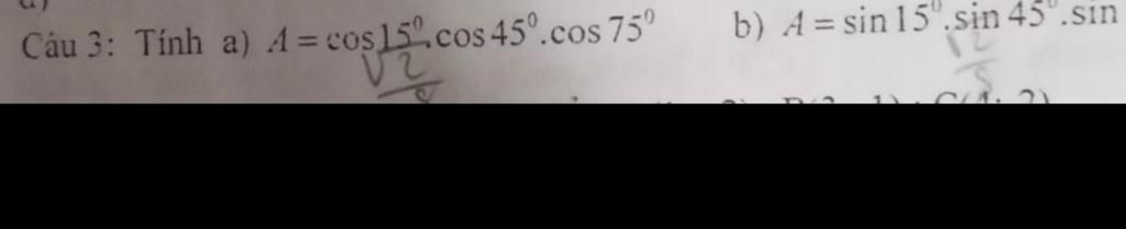 $\begin{array}{l}A=\cos15^o.\cos45^o.\cos75^o\\=(\cos75^o.\cos15^o).\cos45^o\\=\dfrac{1}{2}.[\cos(75^o-15^o)+\cos(75^o+15^o)].\cos45^o\\=\dfrac{1}{2}.(\cos60^o+\cos90^o).\dfrac{\sqrt{2}}{2}\\=\bigg{(}\dfrac{1}{2}.\dfrac{1}{2}+\dfrac{1}{2}.0\bigg{)}.\dfrac{\sqrt{2}}{2}\\=\dfrac{1}{4}.\dfrac{\sqrt{2}}{2}\\=\dfrac{\sqrt{2}}{8}.\end{array}$