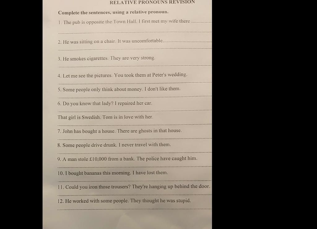 `1.` The pub in which I first met my wife is opposite the Town Hall.