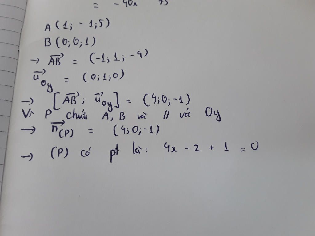 $\Rightarrow \overrightarrow{n}=\left[\overrightarrow{AB};\overrightarrow{j}\right]= (4;0;-1)$ là VTPT của $(P)$