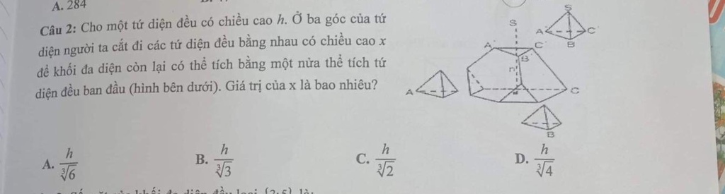 => tổng thể tích 3 phần cắt đi bằng 1/2 thể tích tứ diện ban đầu