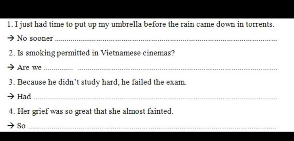 1. No sooner had I had tume to put up my umbrella than the rain came down in forests( đảo ngữ no sooner)