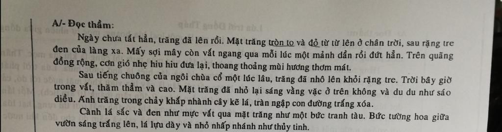 Ngày chưa tắt hẳn, trăng đã lên rồi. Mặt trăng tròn to và đỏ từ từ lên ở chân trời, sau rặng trẻ