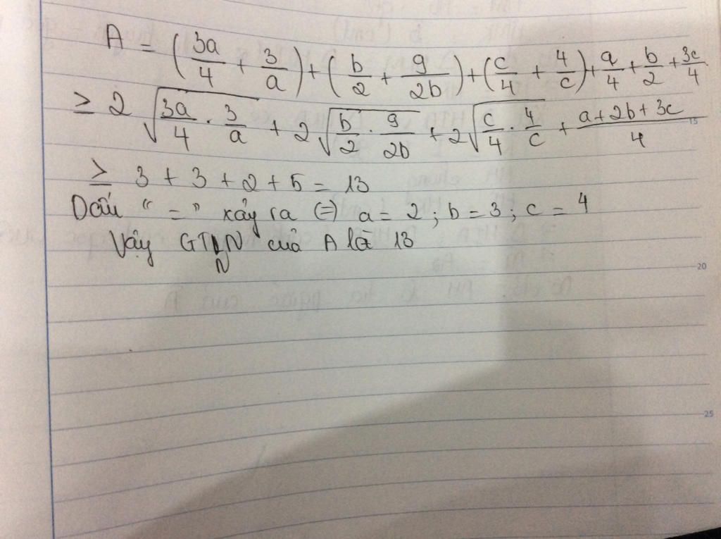 ↔A=$\left(\frac{3a}{4}+\frac{3}{a}\right)+\left(\frac{b}{2}+\frac{9}{2b}\right)+\left(\frac{c}{4}+\frac{4}{c}\right)+\frac{1}{4}\left(a+2b+3c\right)$≥$\ge2\sqrt{\frac{3a}{4}.\frac{3}{a}}+2\sqrt{\frac{b}{2}.\frac{9}{2b}}+2\sqrt{\frac{c}{4}.\frac{4}{c}}+\frac{1}{4}.20$