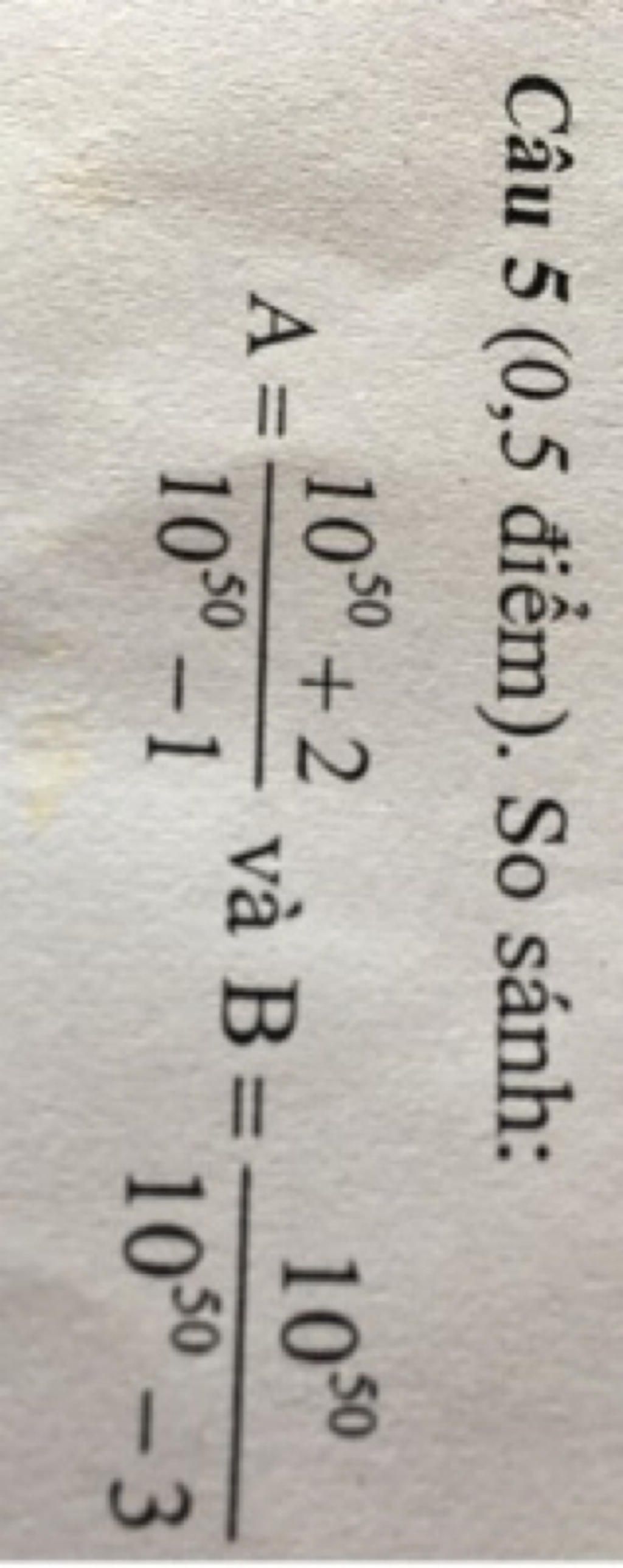 vì 10^50-1>10^50-3⇒3/10^50-1<3/10^50-3⇒A=1+3/10^50-1<B=1+3/10^50-3