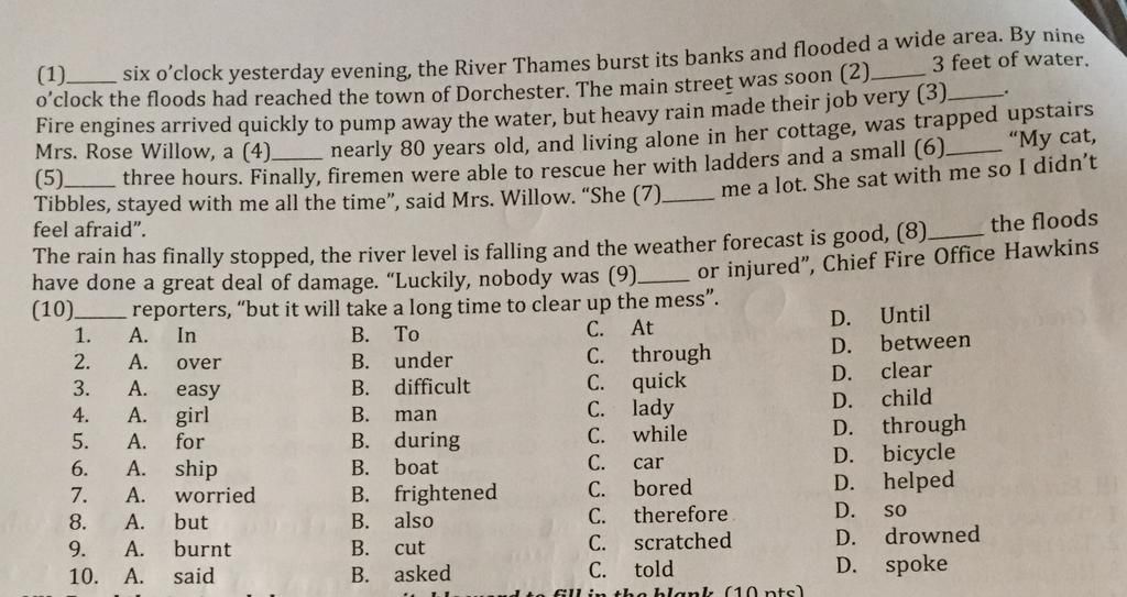 1. At six o'clock yesterday evening, the River Thames burst its banks and flooded a wide area. By nine o'clock the floods had reached the town of Dorchester. The main street was soon 2. under 3 feet of water. Fire engines arrived quickly to pump away the water, but heavy rain made their job very 3.difficult. Mrs. Rose Willow, a 4. lady nearly 80 years old, and living alone in her cottage, was trapped upstairs 5. for three hours. Finally, firemen were able to rescue her with ladders and a small 6.boat. "My cat, Tibbies, stayed with me all the time," said Mrs. Willow. "She 7. helped me a lot. She sat with me, so I didn't feel afraid." The rain has finally stopped, the river level is falling and the weather forecast is good, 8. but the floods have done a great deal of damage. "Luckily, nobody was 9.drowned or injured," Chief Fire office Hawkins 10. told reporters, "but it will take a long time to clear up the mess.