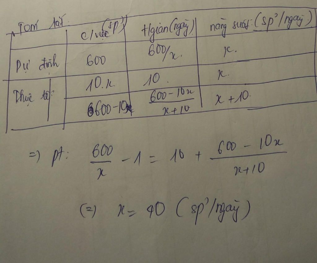 một tổ sản xuất phải làm được 600 sản phẩm trong một thời gian quy định với năng suất như nhau Trong 10 ngày đầu họ thực hiện đúng tiến độ ,những ngày sau họ đã tăng năng suất thêm mỗi ngày 10 sản phẩm ,do đó đã hoàn thành công việc sớm hơn 1 ngày .Tính năng suất ban đầu của tổ sản xuất