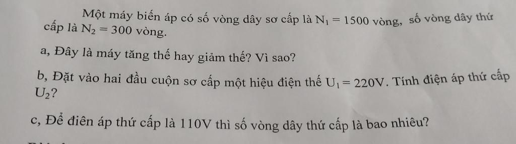a) đây là máy giảm thế vì ta có `(N1)/(N2)`=`(U1)/(U2)`