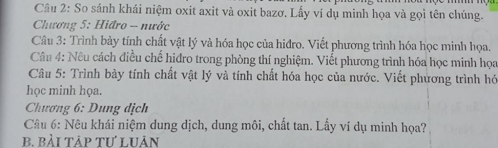 Câu 4: Điều chế hidro trong phòng thí nghiệm bằng cách cho axit( HCl, H2SO4) tác dụng với kim loại(Zn, Fe, Al, Mg)